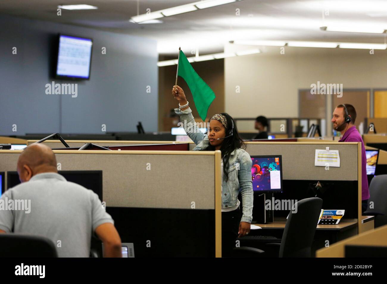 A Customer Service Agent At Covered California S Concord Call Center Waves A Flag For Technical Assistance During The Opening Day Of Enrollment Of The Patient Protection And Affordable Care Act In Concord