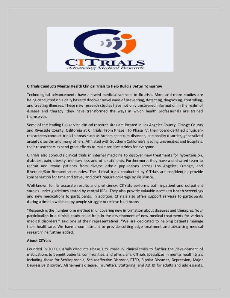 Ci Trials Conducts Mental Health Clinical Trials To Help Build A Bett
