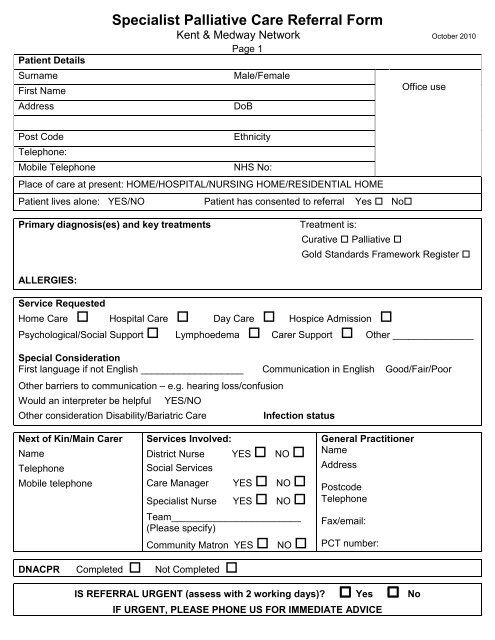 Specialist Palliative Care Referral Form Yes No Pilgrims Hospices