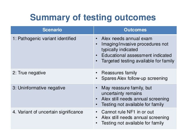 Genetic testing can now be performed prior to implantation before the fertilized egg attaches to the uterus and starts growing or during early pregnancy. The integration of these data resulted into a recommendation for an improved screening. Positive The DNA mutation associated with type 1 or type 2 neurofibromatosis is present Negative The DNA mutation is not present Inconclusive The presence of the DNA mutation is unclear.